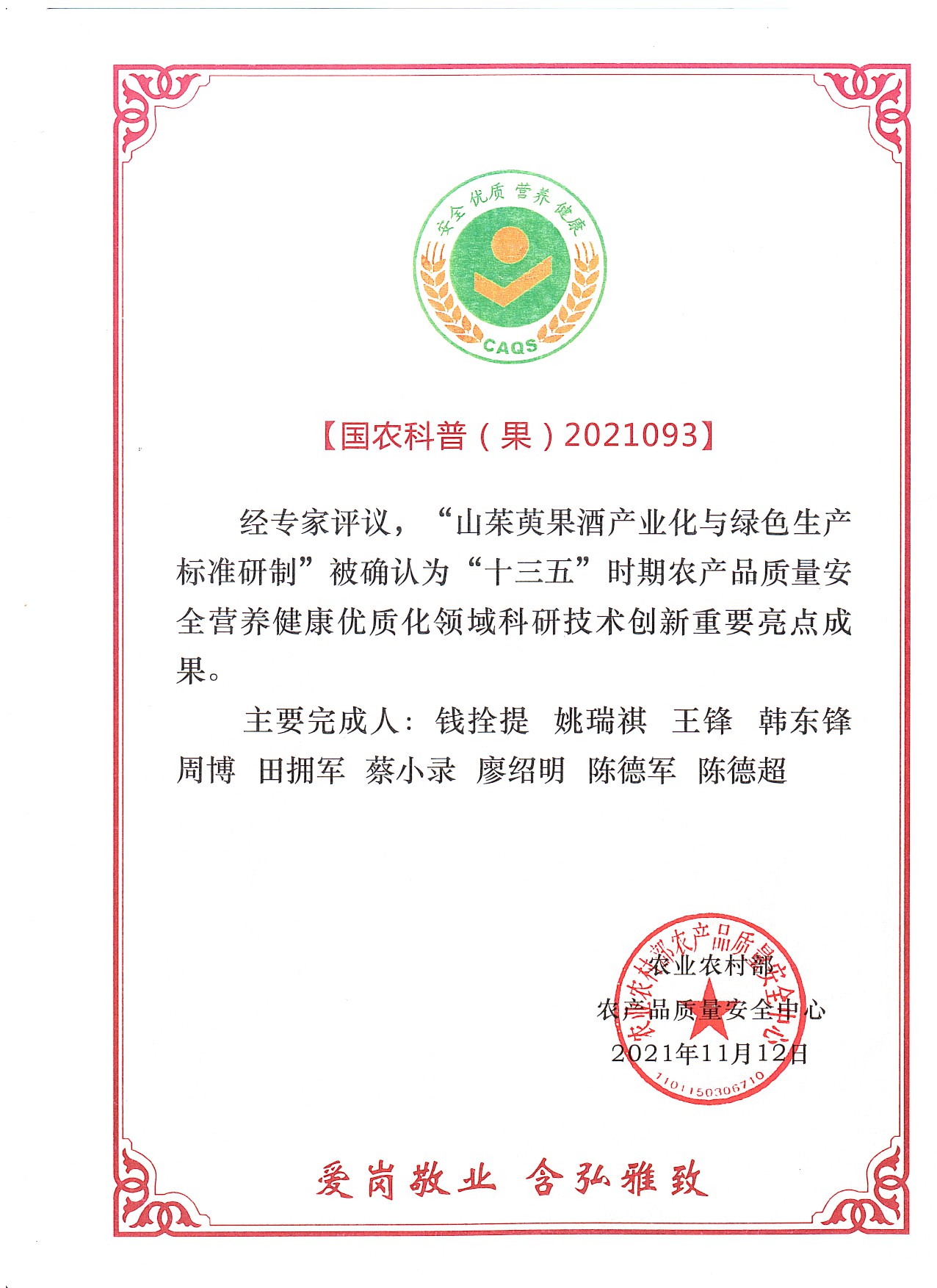 近日,农业农村部农产品质量安全中心公布了《“十三五”时期农产品质量安全营养健康优质化领域科研技术创新重要亮点成果名录》,我校山茱萸产业研发中心团队的“山茱萸果酒产业化与绿色生产标准研制”成为全省唯一入选的科技成果。