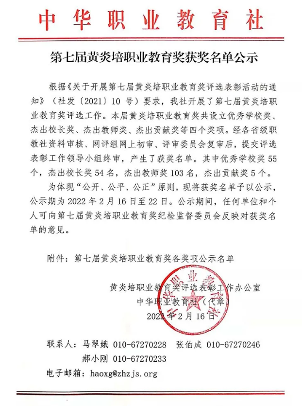2月16日,中华职业教育社公示了第七届黄炎培职业教育奖获奖名单。校长王周锁教授获评杰出校长奖。