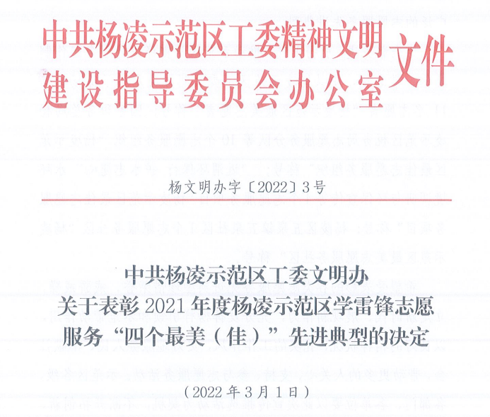 3月1日,杨凌示范区表彰2021年度学雷锋志愿服务“四个最美(佳)”先进典型,经过专家评审、会议研究,共选出11个最美志愿者,10个最佳志愿服务组织,4个最佳志愿服务项目,1个最美志愿服务社区。