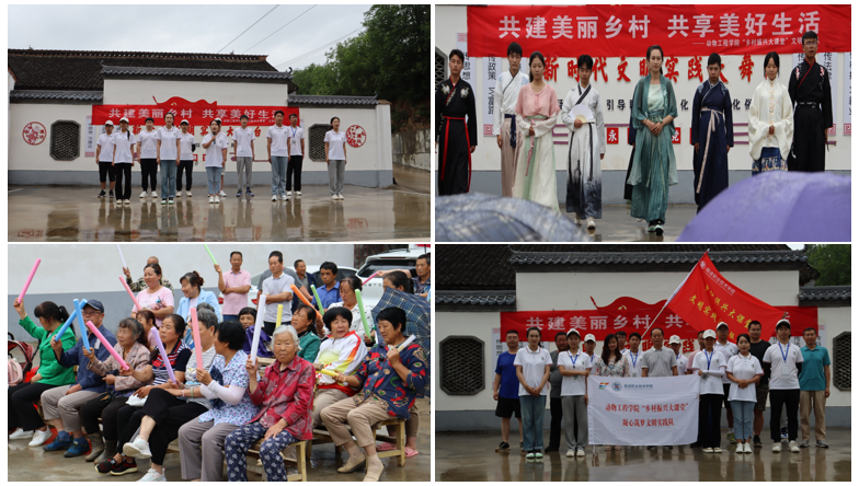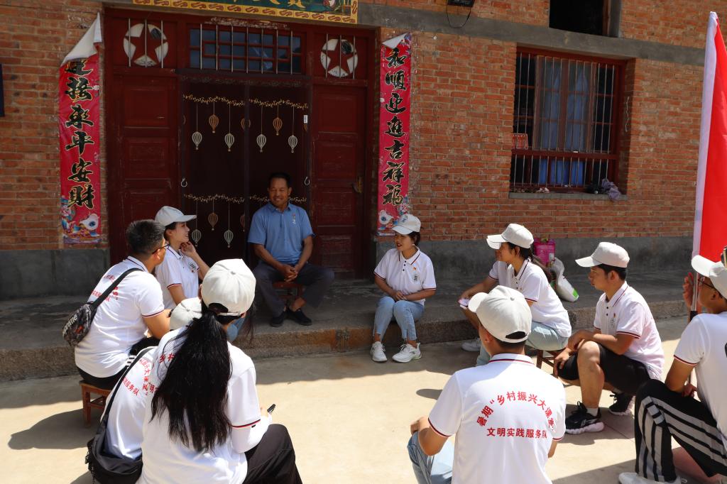 擘画乡村文明“新画卷”。服务队在走访期间,为当地村民开展植物拓染、传统剪纸、英山缠花、绳编等非遗文化展览、非遗技艺教授、非遗项目互动等活动,让非遗文化走进田间地头,让文化自信深植百姓心间。服务队在活动最后为村民们开展了一场“共建美丽乡村 共享美好生活”村校文艺汇演,汉服走秀、独舞、合唱,让欢声笑语漫步在乡间田野,把温暖关怀传递给同乡亲故,为乡村文明建设提供文化滋养和精神动能。