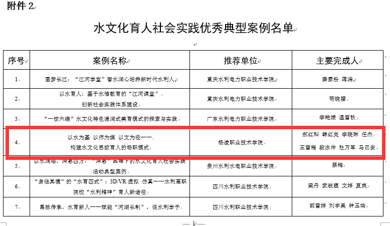 近日,中国水利教育协会公布了第四届水利职业院校水文化育人研讨会相关成果评选结果。由党委宣传部报送的《郑国渠》获“讲好水故事”优秀文艺作品;水利工程学院报送的《以水为基 以师为媒 以文为径——构建水文化思政育人的杨职模式》案例获水文化育人社会实践优秀典型案例。