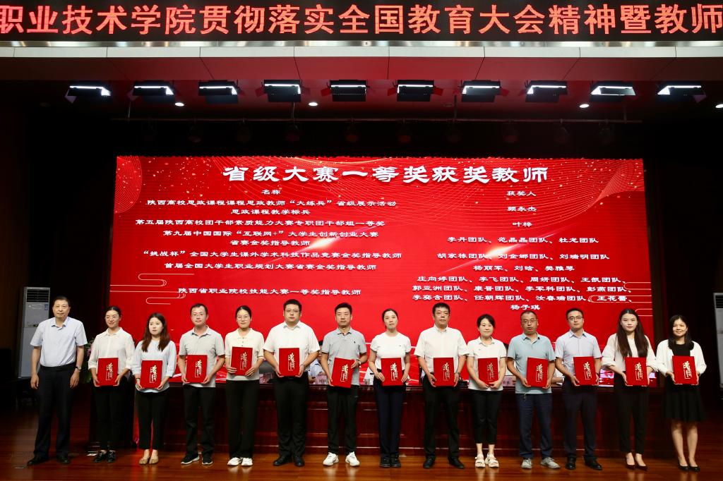 颁奖仪式上,韩明军为光荣从教30年教师颁发荣誉证书和纪念章,为获国家级成果教师颁发荣誉证书。刘瑞明为获省级荣誉、成果教师颁发荣誉证书。王勇胜为国家级大赛获奖教师代表颁发荣誉证书。祝战斌为省级大赛一等奖获奖教师代表颁发荣誉证书。胡俊鹏为省级课程建设获奖教师代表颁发荣誉证书。