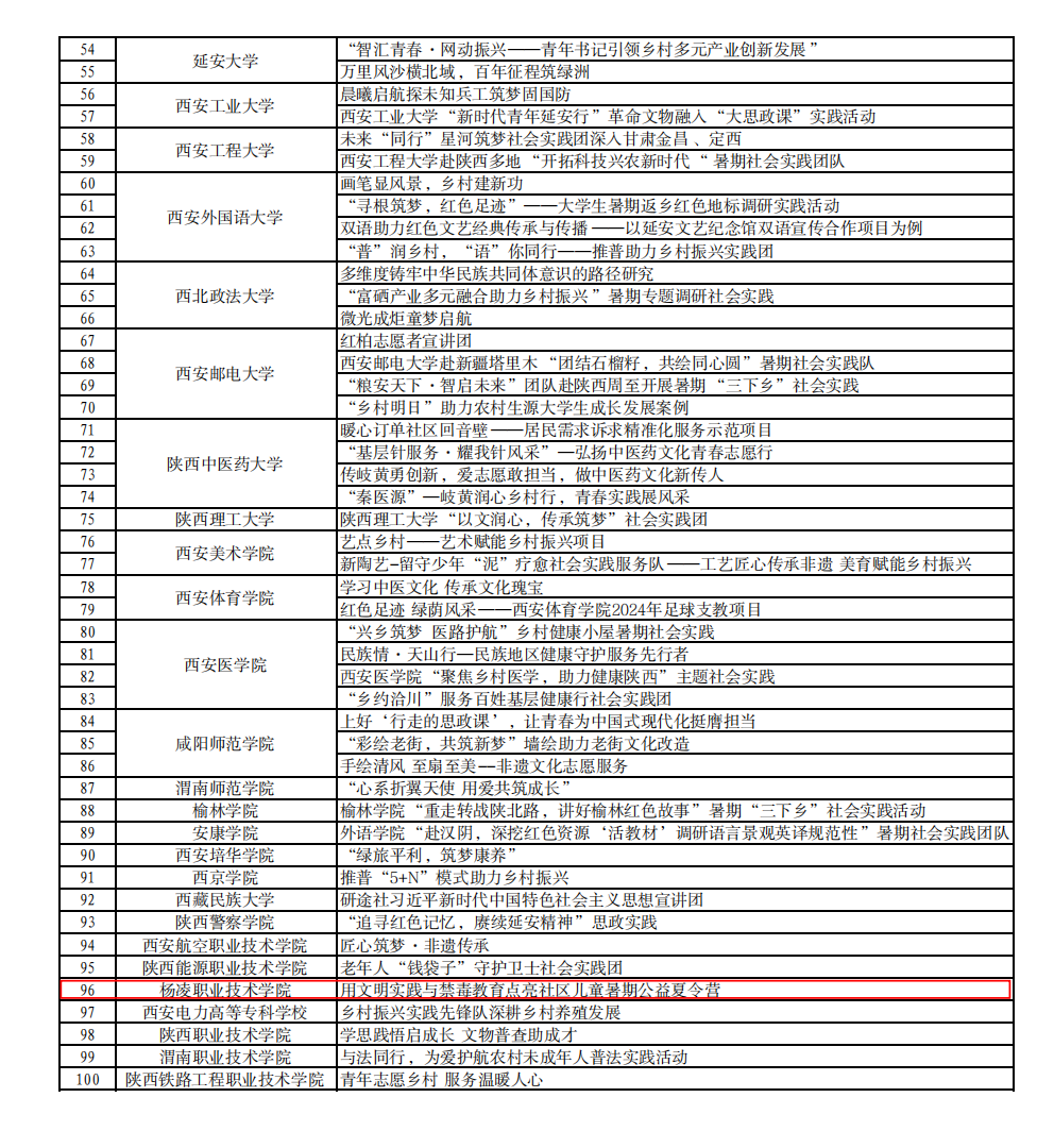 9月18日,省委教育工委对2024年“小我融入大我,青春献给祖国”高校师生主题社会实践项目进行了通报表扬,学校“用文明实践与禁毒教育点亮社区儿童暑期公益夏令营”实践项目获通报表扬。