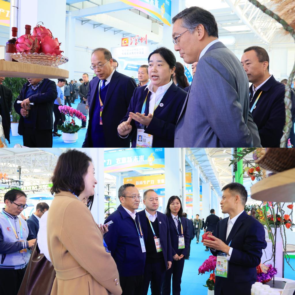我校陕西“最美科技工作者”马志峰教授、马文哲教授,乡村振兴专家黄璞,火龙果产业研发中心主任牛永浩副教授,为前来咨询种植技术的农民朋友“传经送宝”。柬埔寨王国农林渔业部国务秘书皮塞斯·梅斯、农林渔业部国际合作司司长索玛尼·普拉姆来校展位参观,了解学校人才培养和海外分校建设情况,洽谈国际合作事宜。