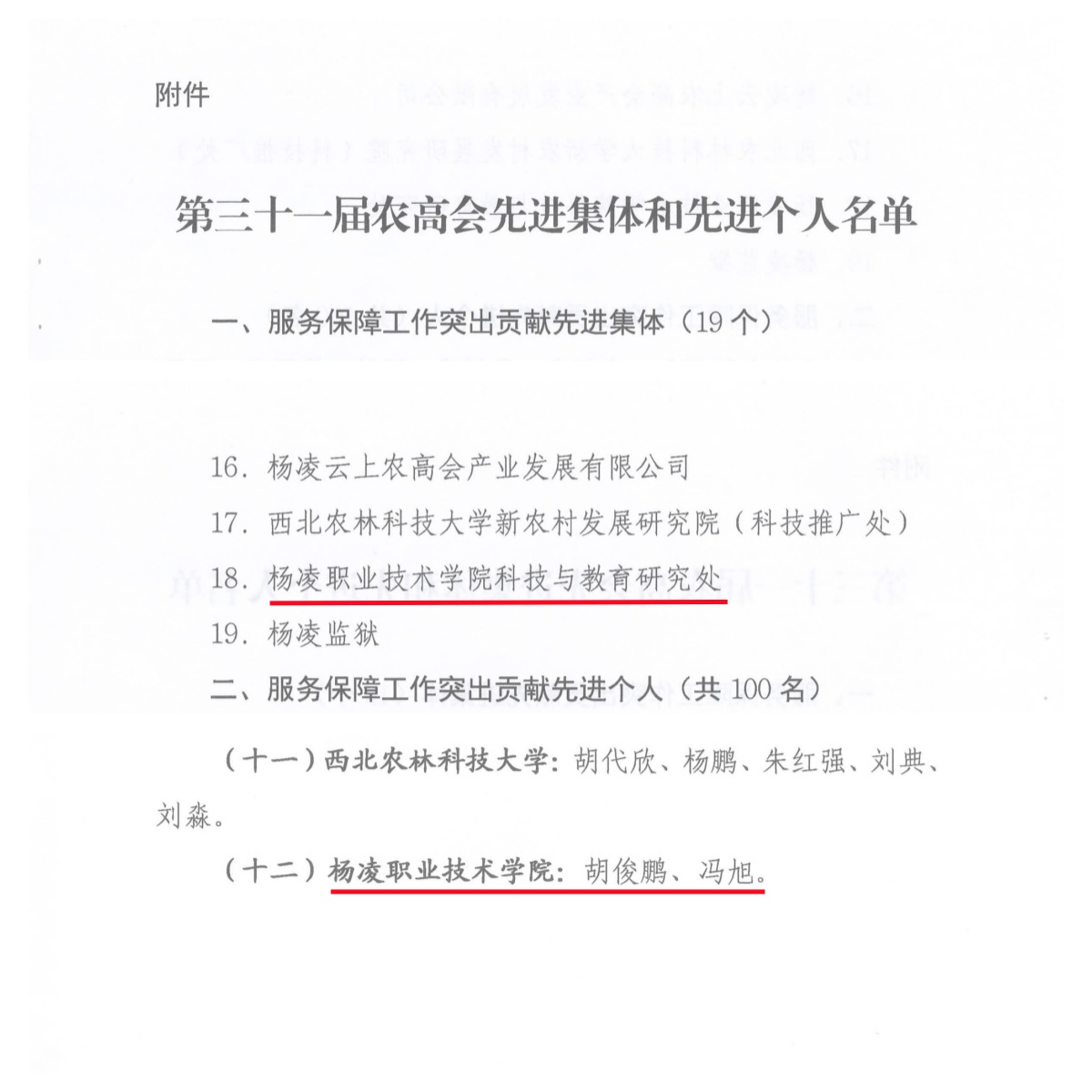 会议表彰了第三十一届农高会服务保障工作突出贡献先进集体和先进个人。我校科技与教育研究处获突出贡献先进集体称号,胡俊鹏和冯旭获突出贡献先进个人称号。