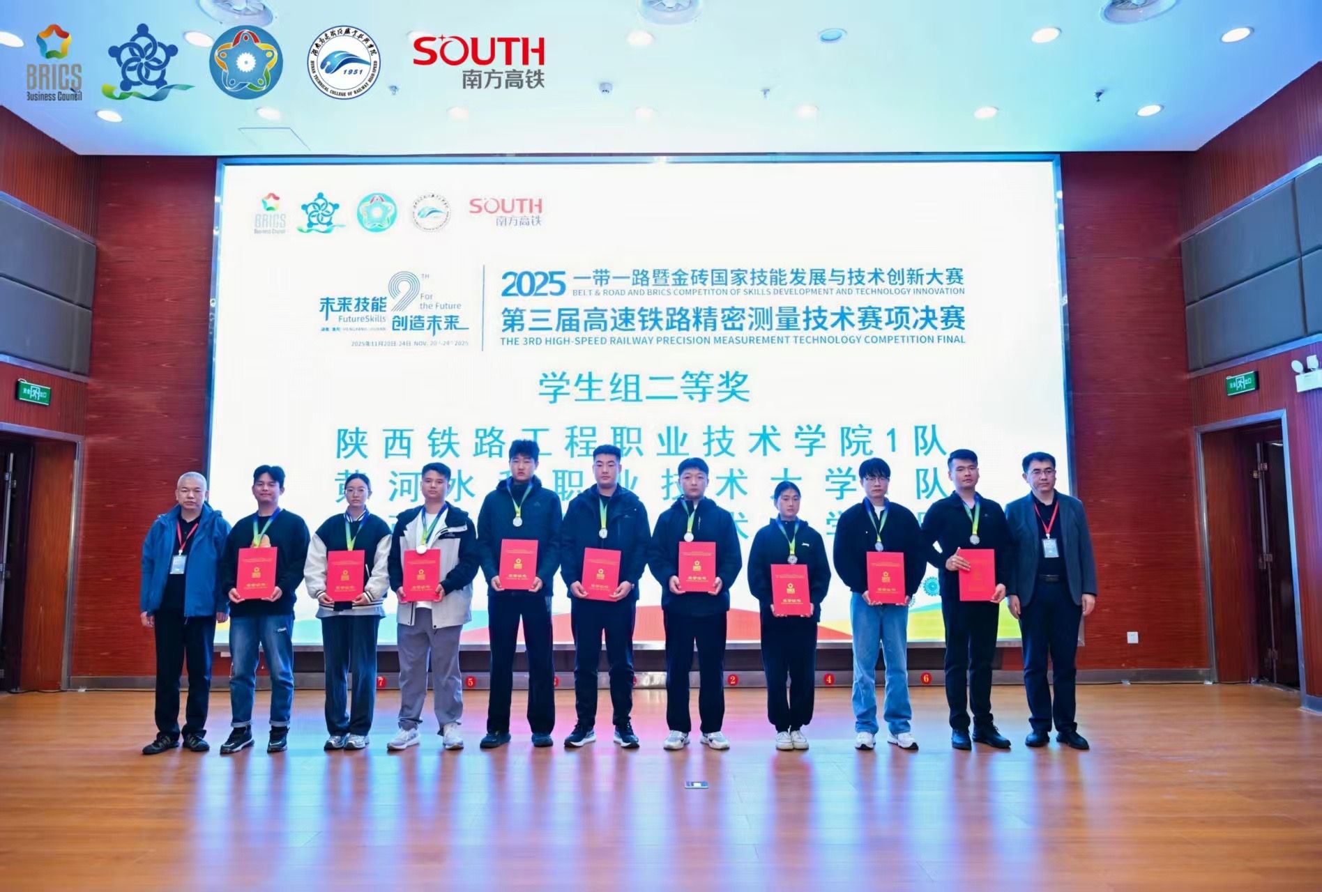 11月20日至24日,2025一带一路暨金砖国家技能发展与技术创新大赛第三届高速铁路精密测量技术赛项全国总决赛在湖南高速铁路职业技术学院落下帷幕。经过激烈角逐,由我校交通与测绘工程学院白广明、房海勃老师指导的两支学生队伍李坤坤、周贵平、王浩三位同学荣获大赛一等奖;聂菁康、张华东、华一冉荣获二等奖。
