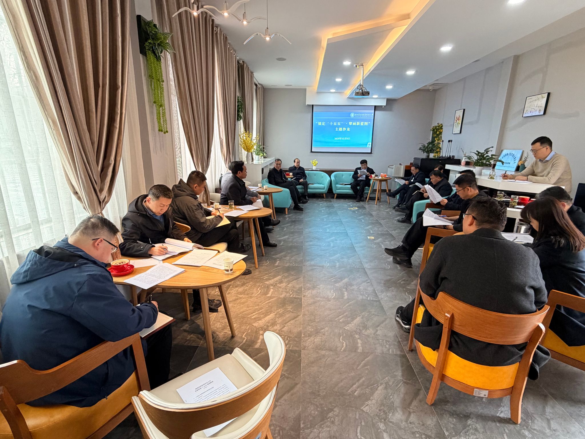 12月9日下午,北校区旅苑创咖里暖意融融、气氛活跃,学校首期“赋能高质量发展”主题沙龙在此举行本期活动聚焦“锚定‘十五五’,擘画新蓝图”,相关部门负责人与校领导围坐一堂,在咖啡香中畅谈未来、碰撞思维,为学校下一阶段发展汇聚灵感与共识。沙龙由党委书记韩明军主持,校长仲伟周党委副书记刘瑞明、王勇胜,党委副书记、纪委书记、监察专员康强,副校长祝战斌出席,相关部门负责人参加