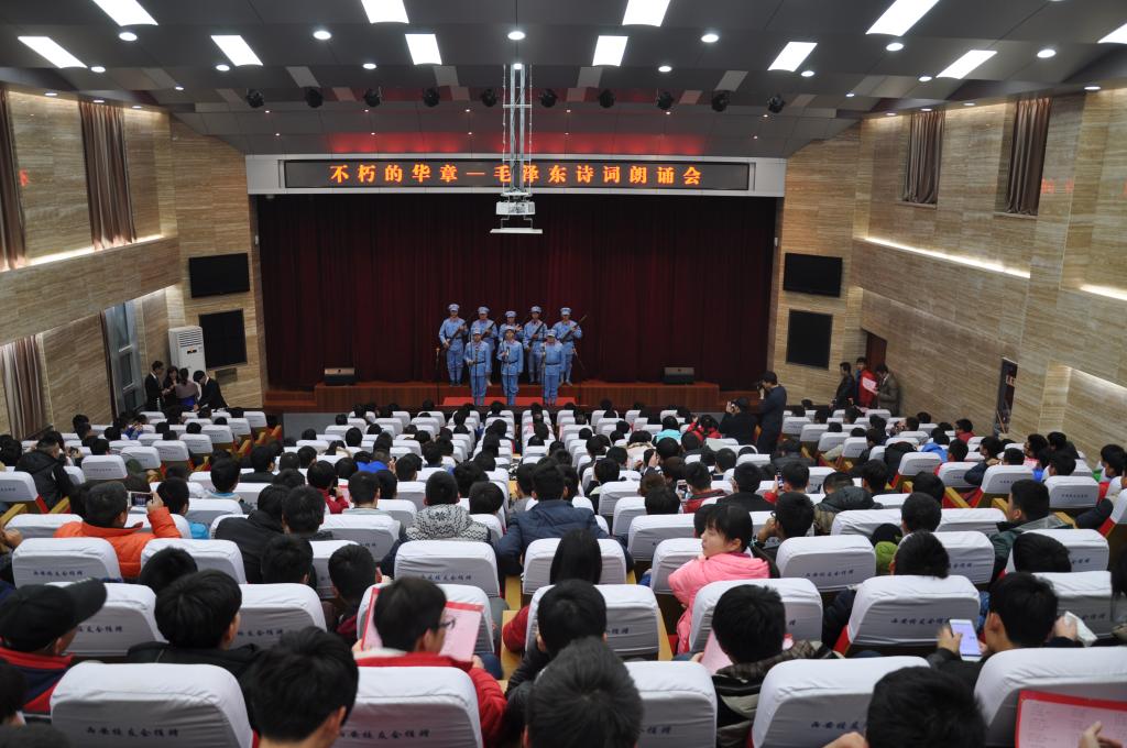 在纪念毛泽东同志诞辰122周年之际,2015年12月21日晚,由思想政治理论课教学部主办、院团委协办的“不朽的华章——毛泽东诗词朗诵会”在醒钟楼思辨堂举行。党委书记赵曼、党委副书记任得元、副院长张永良、张迪出席,各分院负责人、辅导员,思政部全体教师及学生代表共计300余人参加。