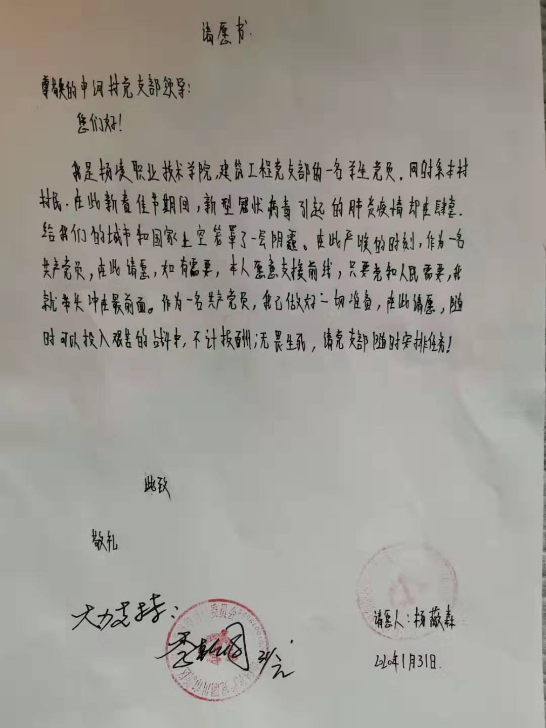“尊敬的申河村党支部领导:您们好!我是杨凌职业技术学院建筑工程党支部的一名学生党员,同时系本村村民。在此新春佳节期间,新型冠状病毒引起的肺炎疫情却在肆虐,给我们的城市和国家上空笼罩了一层阴霾。在此严峻的时刻,作为一名共产党员,在此请愿,如有需要,本人愿意支援前线,只要党和人民需要,我就带头冲在最前面。作为一名共产党员,我已做好一切准备,在此请愿,随时可以投入艰苦的战斗中,不计报酬,无畏生死,请党支部随时安排任务!”