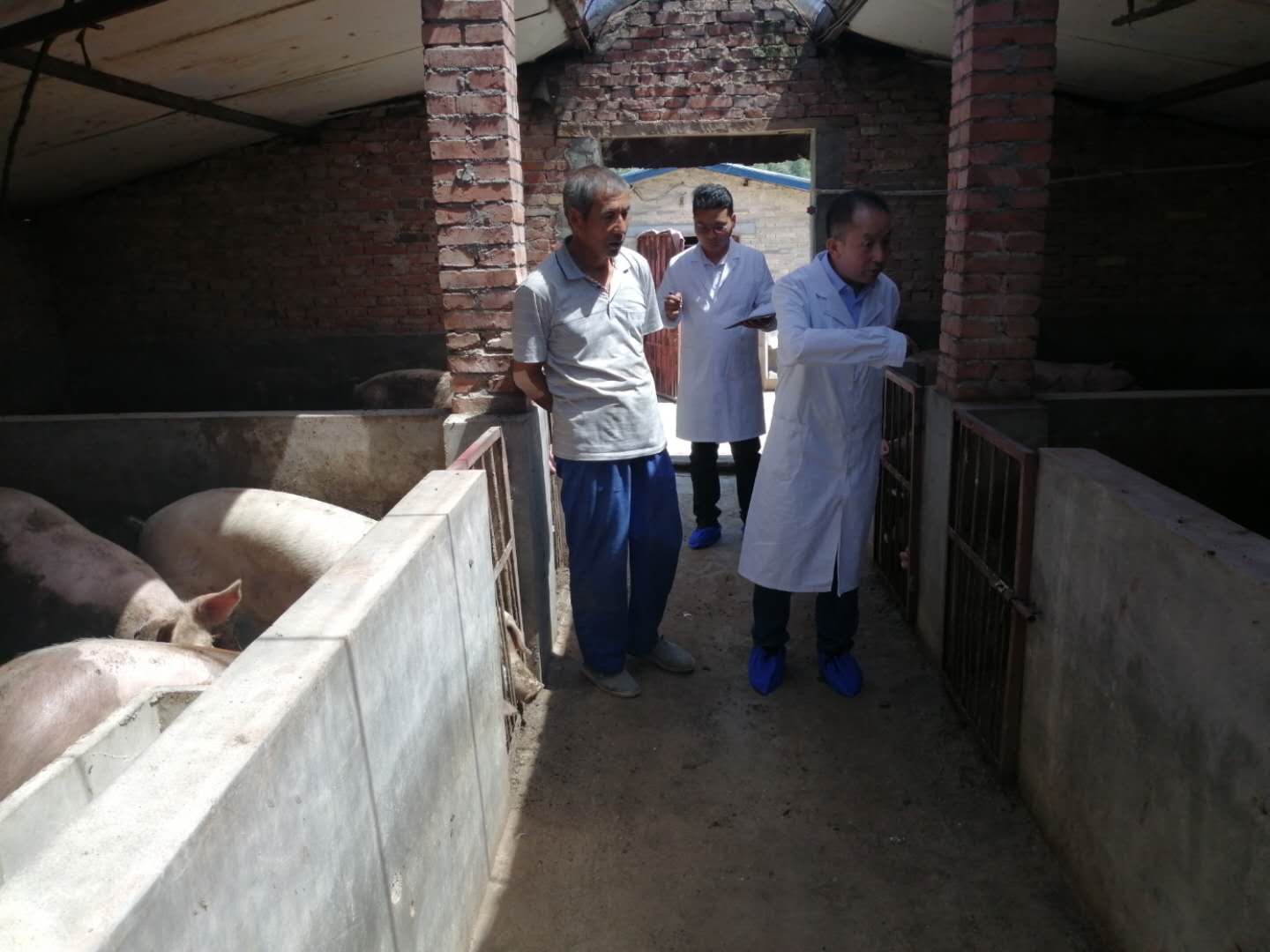 在紫石崖村,3位老师深入猪舍详细查看猪舍环境温度、湿度、有害气体浓度以及猪的采食情况、健康状况,对生产中出现的问题现场进行技术指导并同紫石崖村委会书记兼主任舒增明、养殖户负责人及该村兼职防疫员等进行了交流座谈,详细了解该村生猪生产现状以及村委会对发展生猪产业的规划,了解养殖户生产模式、存在的问题。根据各养殖户的生产特点,项目负责人闫红军从仔猪引进、饲料调配、疫病防控、粪污处理等方面为养殖户提出了可行的解决途径及方法。