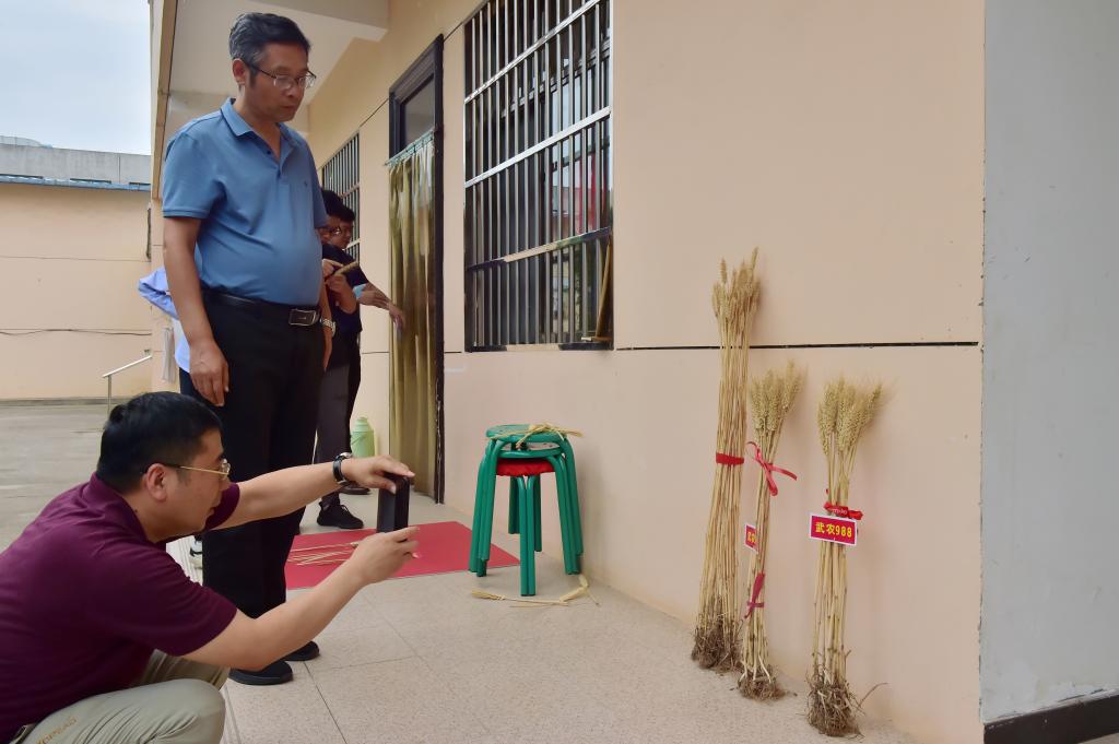 吕修涛一行对我校武农981、武农988两个品种和常规品种进行了性状对比研究。赵瑜研究员对武农981、武农988两个品种的选育背景及品种矮秆早熟、大穗大粒的高产性能进行了介绍,并对区域试验和生产试验的开展情况进行了汇报。