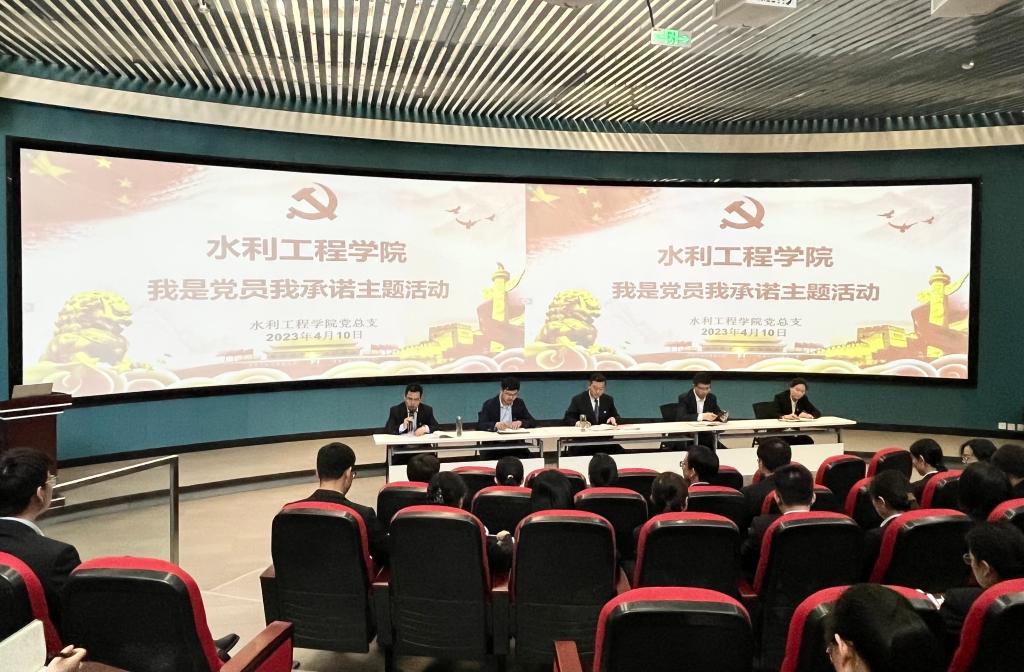 410午,水利工程学院党总支开展“我是党员我承诺”主题活动,全体教工党员和学生党员代表参加会议,会议由党总支副书记、院长郝红科主持。