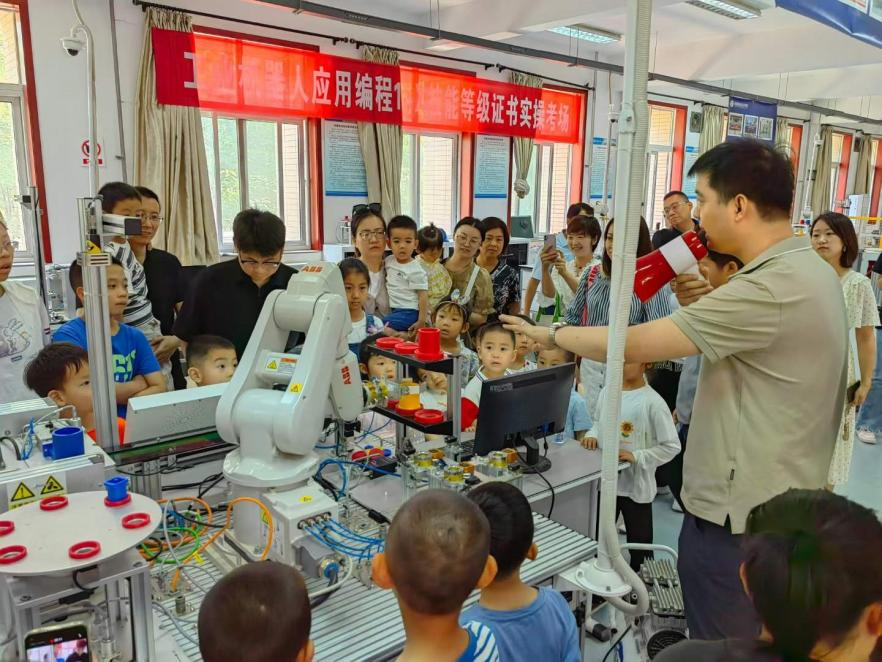 5月18日上午在学校工业机器人实训中心举办了工业机器人技术科普教育活动。中小学生参观了工业机器人视觉装配和生产单元运行流程,与7台联动的机器人“跳舞”,与会画画的机器人开展趣味游戏,激发了中小学生的科学探索与创新意识。