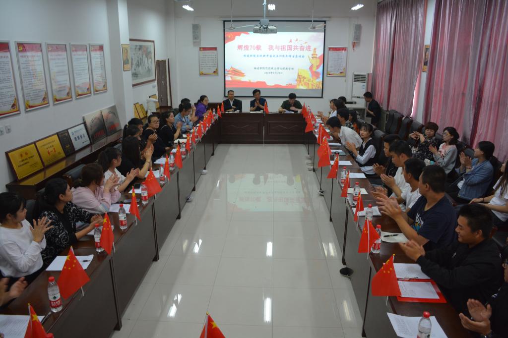 在建国70周年之际,9月29日下午,思政部组织召开了以“辉煌七十载 我与祖国共奋进”为主题的庆祝新中国成立70周年师生座谈会。思政课教学部、经济与贸易分院党总支负责人,旅游与管理分院学工办负责人,以及思政课教学部全体教师、2019级新生代表等40余人参加了座谈会。