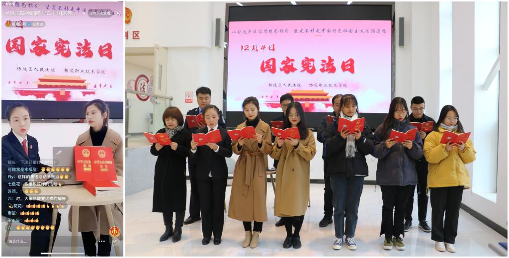 ——开展网络普法宣传活动。在124日的“国家宪法日”,联合杨陵区人民法院携手开展网络普法宣传活动。在法院负责人带领下,师生们先后参观了诉讼服务中心、法治宣传展示区、文化长廊、审判法庭和办公室等场所,通过听取讲解、实地参观和对话交流,身临其境地学习法院审判执行工作,感受浓厚的法治文化氛围。在直播环节,师生们全程观看网络直播,线上线下同步互动。随后,法院的法官干警同师生肃穆站立,手捧《宪法》和在线网友共同诵读了宪法,通过零距离感受司法,深刻体会宪法法律就在身边。