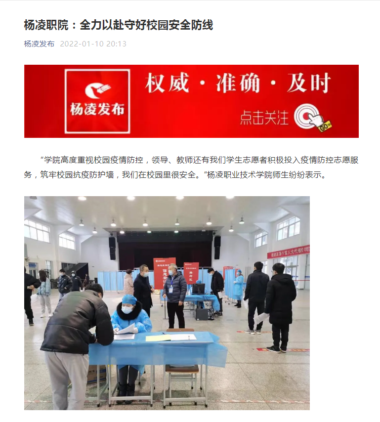 “学院高度重视校园疫情防控,领导、教师还有我们学生志愿者积极投入疫情防控志愿服务,筑牢校园抗疫防护墙,我们在校园里很安全。”杨凌职业技术学院师生纷纷表示。