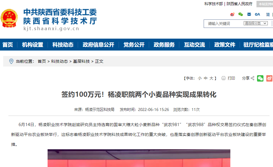 【陕西省科学技术厅】签约100万元!杨凌职院两个小麦品种实现成果转化