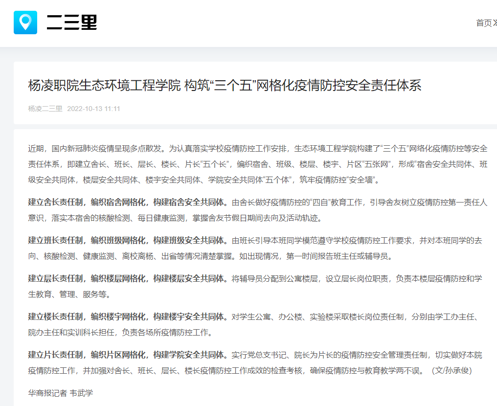 【二三里】杨凌职院生态环境工程学院 构筑“三个五”网格化疫情防控安全责任体系
