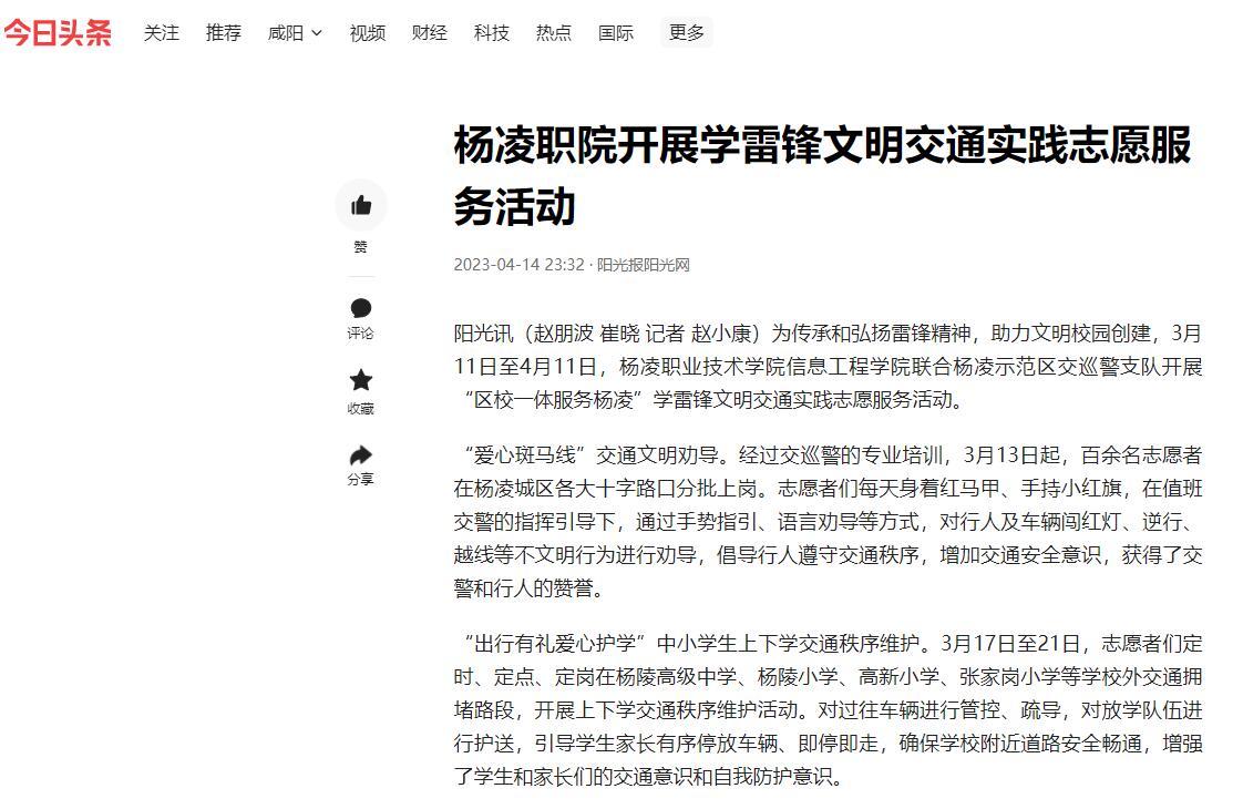 (赵朋波 崔晓 记者 赵小康)为传承和弘扬雷锋精神,助力文明校园创建,3月11日至4月11日,杨凌职业技术学院信息工程学院联合杨凌示范区交巡警支队开展“区校一体服务杨凌”学雷锋文明交通实践志愿服务活动。