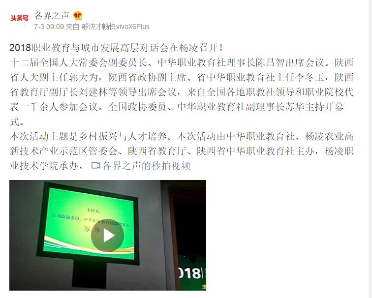 2018职业教育与城市发展高层对话会在杨凌召开! 十二届全国人大常委会副委员长、中华职业教育社理事长陈昌智出席会议。陕西省人大常委会副主任郭大为,陕西省政协副主席、省中华职业教育社主任李冬玉,陕西省教育厅副厅长刘建林等领导出席会议,来自全国各地职教社领导和职业院校代表一千余人参加会议。全国政协委员、中华职业教育社副理事长苏华主持开幕式。本次活动主题是乡村振兴与人才培养。本次活动由中华职业教育社、杨凌农业高新技术产业示范区管委会、陕西省教育厅、陕西省中华职业教育社主办,杨凌职业技术学院承办。