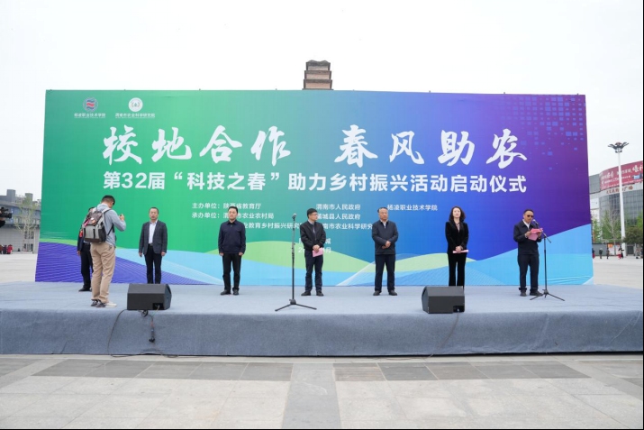 阳光讯(记者 赵小康 通讯员 马玲娟 文/图)4月10日,由陕西省教育厅、渭南市委、市政府和杨凌职业技术学院主办的第32届“科技之春”助力乡村振兴活动启动仪式在渭南市蒲城县中心广场举行。杨凌职业技术学院党委书记王周锁宣布第32届“科技之春”助力乡村振兴活动启动。省教育厅高校技术转移中心主任田鹏,渭南市农业农村局党委委员、副局长刘刚、党组成员、副局长普布顿珠,渭南市农科院院长王杨军,杨凌职业技术学院副校长胡俊鹏,蒲城县副县长冯新等出席启动仪式。