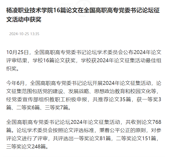 今年6月,全国高职高专党委书记论坛开展2024年论文征集活动,论文征集范围包括党的建设、发展战略、思想政治教育和校园文化等,经党委宣传部组织教职工积极申报,共推荐论文35篇,获一等奖3篇、二等奖6篇、三等奖7篇。