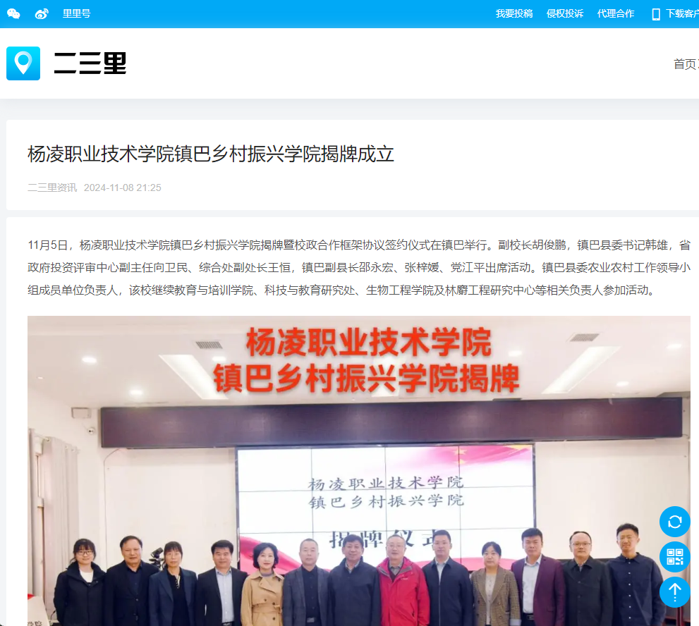 11月5日,杨凌职业技术学院镇巴乡村振兴学院揭牌暨校政合作框架协议签约仪式在镇巴举行。副校长胡俊鹏,镇巴县委书记韩雄,省政府投资评审中心副主任向卫民、综合处副处长王恒,镇巴副县长邵永宏、张梓媛、党江平出席活动。镇巴县委农业农村工作领导小组成员单位负责人,该校继续教育与培训学院、科技与教育研究处、生物工程学院及林麝工程研究中心等相关负责人参加活动。