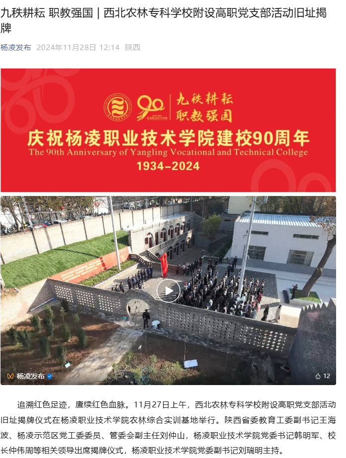 【杨凌发布】九秩耕耘 职教强国 | 西北农林专科学校附设高职党支部活动旧址揭牌
