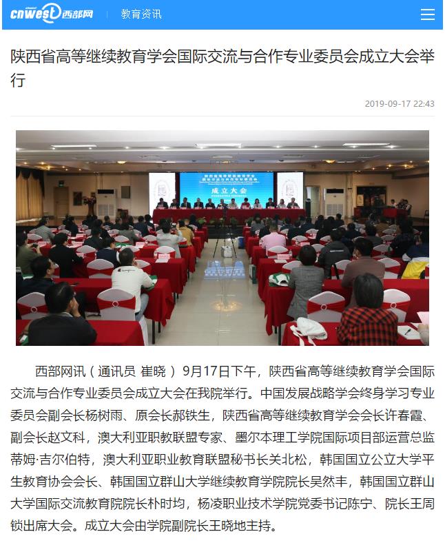 西部网讯 ( 通讯员 崔晓 )9月17日下午,陕西省高等继续教育学会国际交流与合作专业委员会成立大会在我院举行。中国发展战略学会终身学习专业委员会副会长杨树雨、原会长郝铁生,陕西省高等继续教育学会会长许春霞、副会长赵文科,澳大利亚职教联盟专家、墨尔本理工学院国际项目部运营总监蒂姆·吉尔伯特,澳大利亚职业教育联盟秘书长关北松,韩国国立公立大学平生教育协会会长、韩国国立群山大学继续教育学院院长吴然丰,韩国国立群山大学国际交流教育院院长朴时均,杨凌职业技术学院党委书记陈宁、院长王周锁出席大会。成立大会由学院副院长王晓地主持。