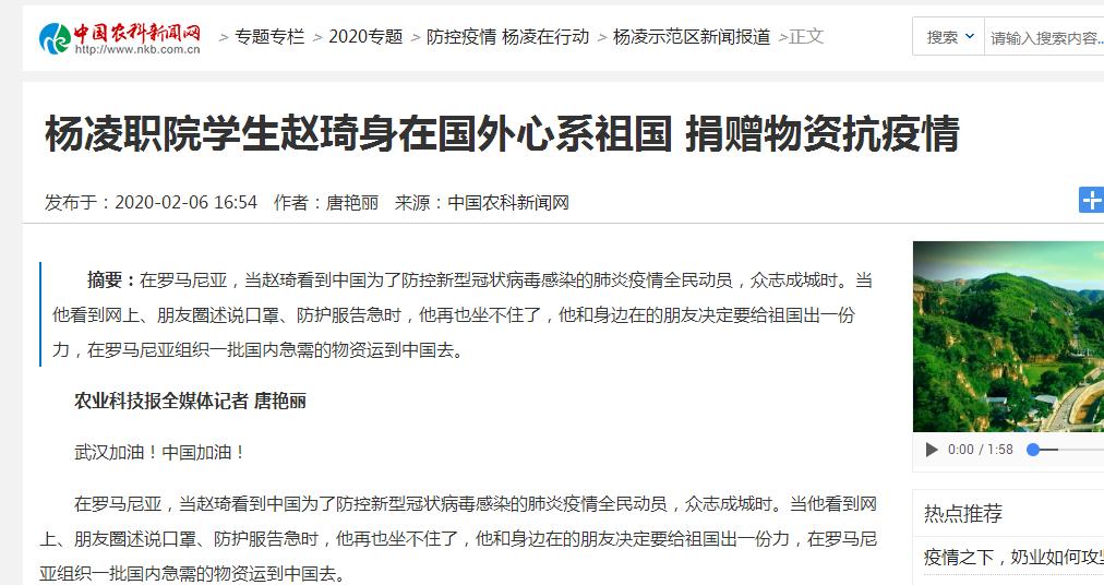 【中国农科新闻网】杨凌职院学生赵琦身在国外心系祖国 捐赠物资抗疫情