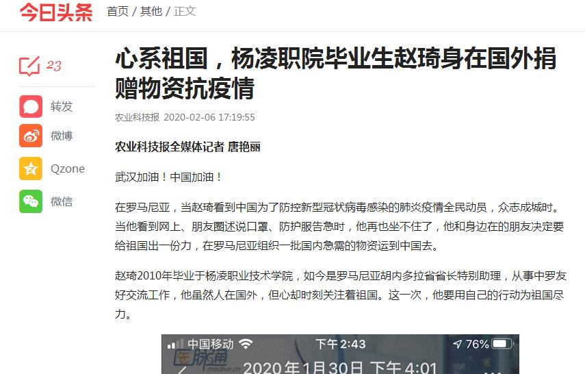 【今日头条】心系祖国,杨凌职院毕业生赵琦身在国外捐赠物资抗疫情