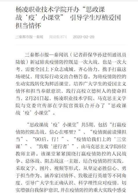 【三秦都市报】杨凌职业技术学院开办“思政课战‘疫’小课堂” 引导学生厚植爱国担当情怀