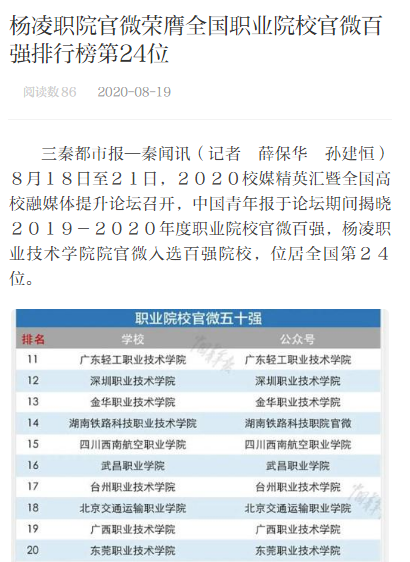 【三秦都市报】喜讯!杨凌职院官微荣膺全国职业院校官微百强排行榜第24位