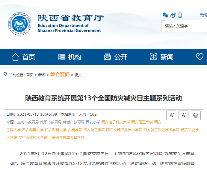 【陕西省教育厅】陕西教育系统开展第13个全国防灾减灾日主题系列活动