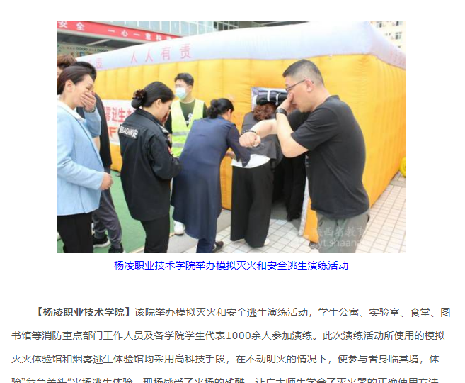 【杨凌职业技术学院】该院举办模拟灭火和安全逃生演练活动,学生公寓、实验室、食堂、图书馆等消防重点部门工作人员及各学院学生代表1000余人参加演练。此次演练活动所使用的模拟灭火体验馆和烟雾逃生体验馆均采用高科技手段,在不动明火的情况下,使参与者身临其境,体验“危急关头”火场逃生体验,现场感受了火场的残酷,让广大师生学会了灭火器的正确使用方法,提升了大家的自救能力,提高了师生员工的消防安全意识,营造了浓厚的校园消防安全氛围。师生纷纷表示,体验式、场景式演练是一种很新颖的教育方式,通过亲身参与、亲身操练、亲身感悟,效果明显,收获很大。