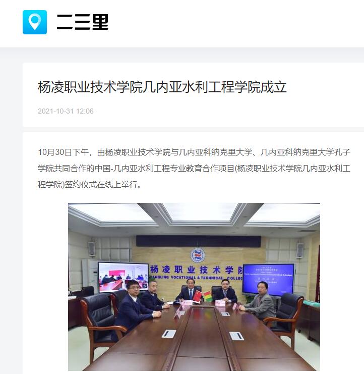 10月30日下午,由杨凌职业技术学院与几内亚科纳克里大学、几内亚科纳克里大学孔子学院共同合作的中国-几内亚水利工程专业教育合作项目(杨凌职业技术学院几内亚水利工程学院)签约仪式在线上举行。