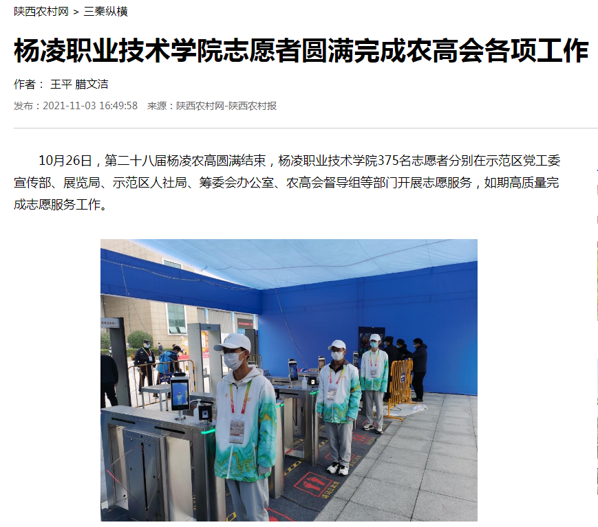 10月26日,第二十八届杨凌农高圆满结束,杨凌职业技术学院375名志愿者分别在示范区党工委宣传部、展览局、示范区人社局、筹委会办公室、农高会督导组等部门开展志愿服务,如期高质量完成志愿服务工作。