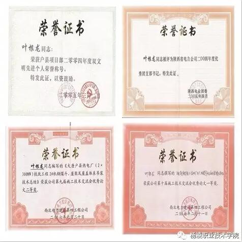 由于叶根龙工作中勤奋好学、兢兢业业,在每一个岗位上他都不断反思总结,不断历练提高。因此,从2004年到2016年,在他参加工作的这十余年里,获得了无数奖励及荣誉:2005年3月被评为“户县项目部2004年度双文明先进个人”,4月荣获“2004年度陕西省电力公司优秀团支部书记”;2006年1月在公司第九届技术交流会上荣获“二等奖”;2007年2月在公司第十届技术交流会上荣获“一等奖”, 4月被评为西北电建四公司第二届“十佳青年”;2008年3月被评为“涟源项目部2007年度双文明先进个人”;2009年2月荣获陕西省电力公司2008年度“青年岗位能手”称号,1月在公司第十二届技术交流会上荣获“三等奖”,6月荣获陕西省电力公司2009年度“六好共产党员”称号;2010年2月在公司第十三届技术交流会上荣获“一等奖”;2011年2月荣获西北电建四公司2010年度“双文明先进个人“;2012年1月在公司第十五届技术交流会上荣获“一等奖”,2012年2月荣获西北电建四公司2011年度“双文明先进个人”;2014年6月被评为西北电建四公司2014年度“优秀共产党员”;2015年5月被评为西北有限公司2015年度“优秀青年”, 7月被评为公司2015年度“八大先锋共产党员”;2016年6月被评为公司2016年度“优秀共产党员”。